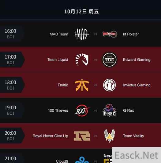 第二天 10月12日:第三天 16:00 MAD-VS-KT 17:00 TL-VS-EDG 18:00 FNC-VS-IG 19:00 100-VS-GRX 20:00 RNG-VS-VIT 21:00 C9-VS-Gen.G