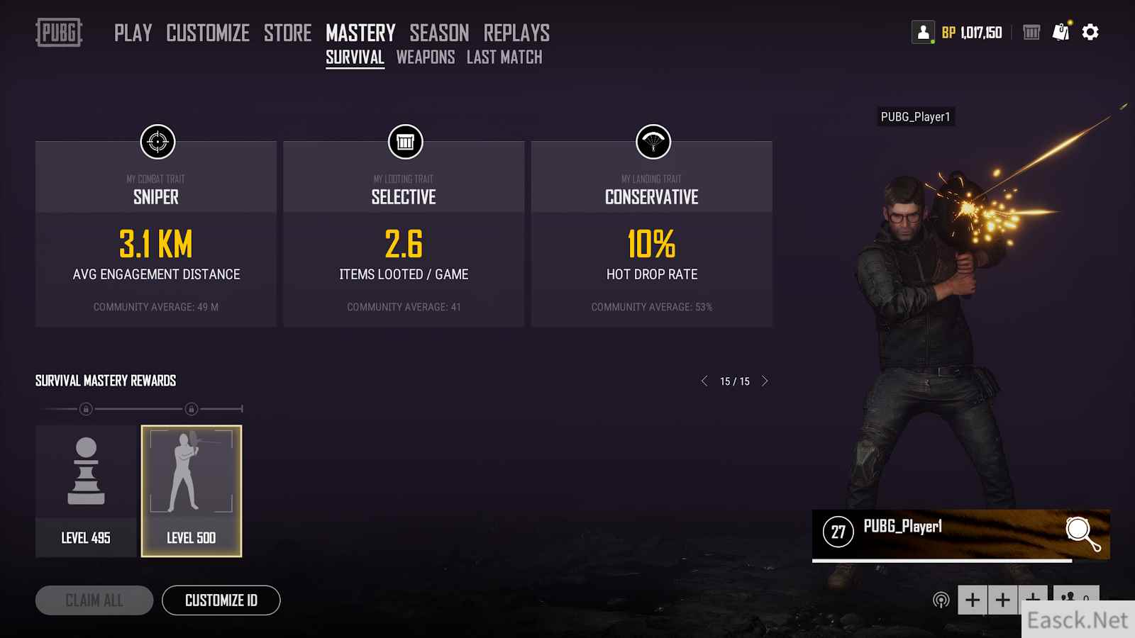 欢迎回到绝地岛,生存者们! 去年,为了在PUBG中建立一个体系完整且具有连贯性的进程系统,我们成立了一支针对熟练度系统的开发团队。通过反馈我们了解到,玩家们希望能在游戏里追踪自己的游戏战绩,并通过更多方法来确认自己在游戏中所获得的成长。为此,在今年4月,我们推出了进程系统的第一个功能一一武器熟练度。十分感谢各位玩家对我们的大力支持,今天,我们终于能十分荣幸地为各位介绍进程系统的下一个功能一一生存熟练度了。 什么是生存熟练度? 生存熟练度是与武器熟练度相对应的系统。如果说武器熟练度体现了您对战斗的熟练程度的话,那么生存熟练度则是注重于您的游戏过程。生存熟练度的目标是在每场比赛结束后帮助您确认自身的能力,并给予您相应的奖励。您将直接决定自己要成为什么类型的玩家。
