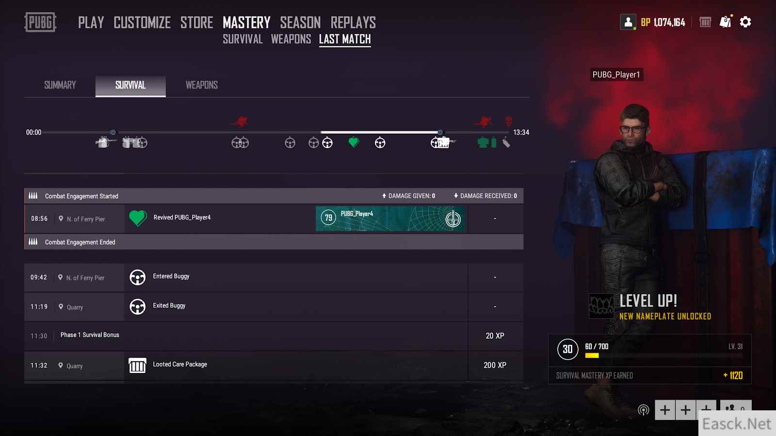 此外,我们还在“最后一场”画面中添加了全新的“生存时间轴”。该功能可以让您对自己在比赛中所做出的所有生存行动的详细概要进行回顾。生存行动包括(但不限于)战斗、拾取物资和治疗等行为。