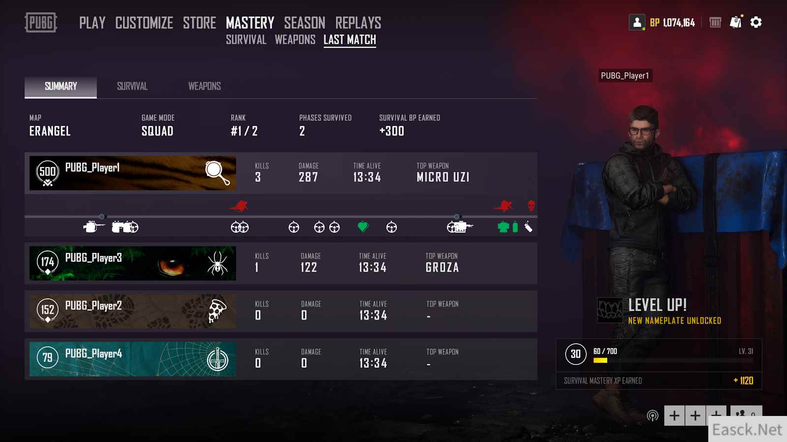 在此功能推出后,您将能在“最后一场”画面中查看队友及您所淘汰敌人的ID。今后我们将会继续努力为PUBG ID卡添加更多的分享功能和自定义项目。我们也期待您能提出反馈意见,告诉我们您希望在自己的ID中加上些什么内容。 对“最后一场”所做的改动 我们还在“最后一场”画面中新增了若干个新栏目,以协助您更好地跟进自己在各场比赛中的成长。第一个要提到的是新增的“概要”栏目,它将为各位玩家提供关于自身进程和所取得成果的高级信息。如果您经常进行四排或双排的话,您也可以在这里追踪一起进行过比赛的队友们的生存数据统计。