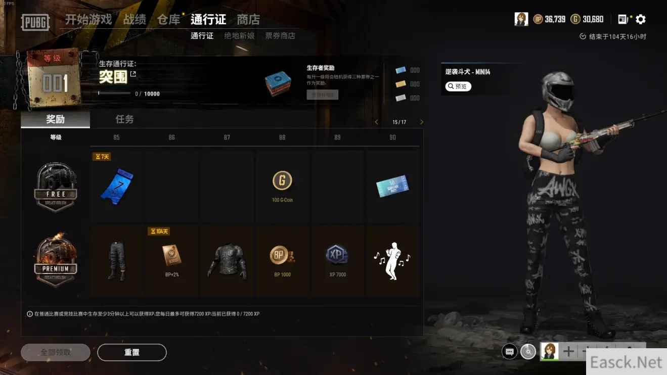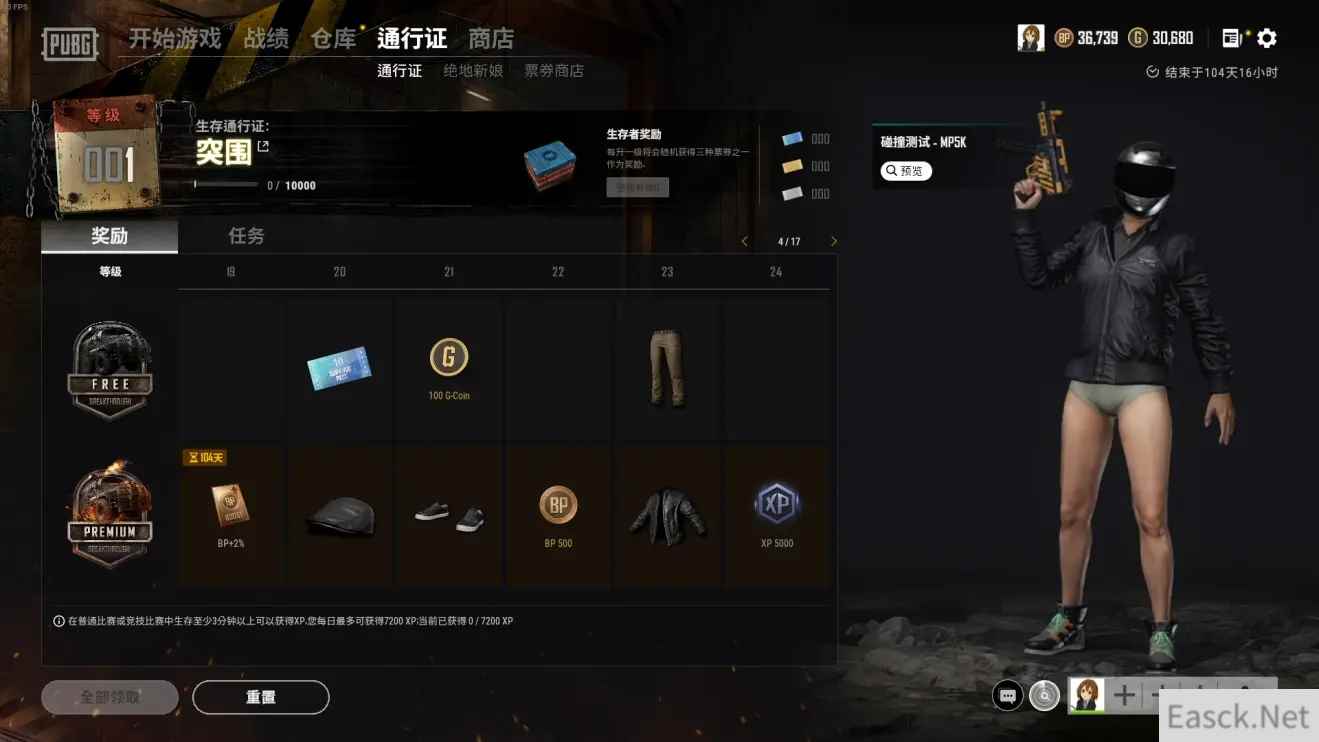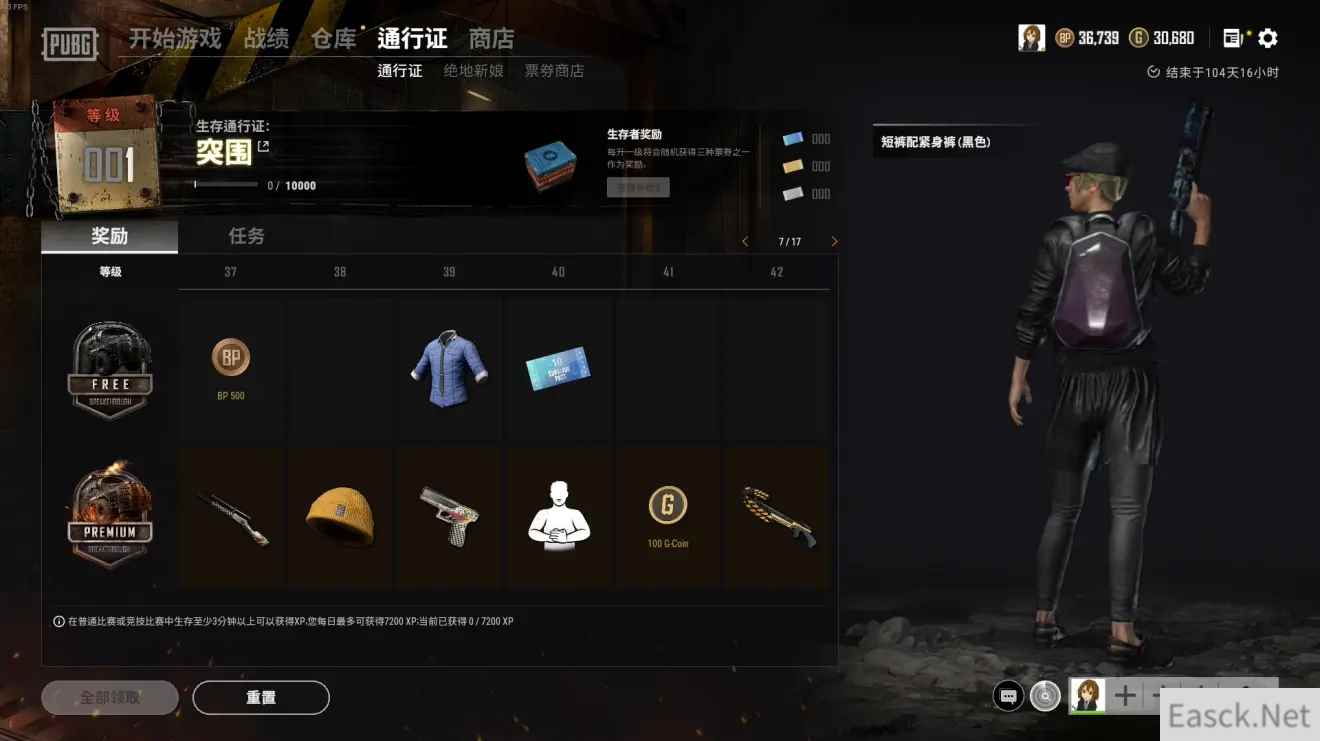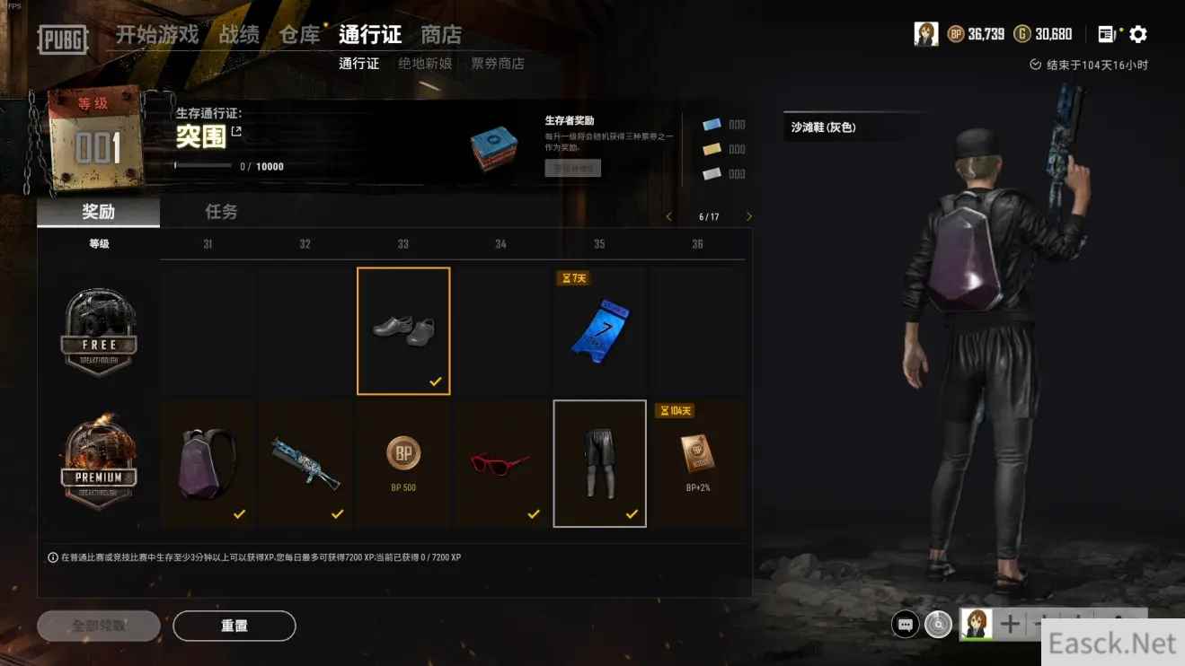 31-36级 上:沙滩鞋((灰色),单预设栏使用券(7天) 下:朱莉的潜行者背包(1级),猎食纪元-PP-19 BIZON,BP 500,精致的眼镜(红色),短裤配紧身裤(黑色),BP+2%