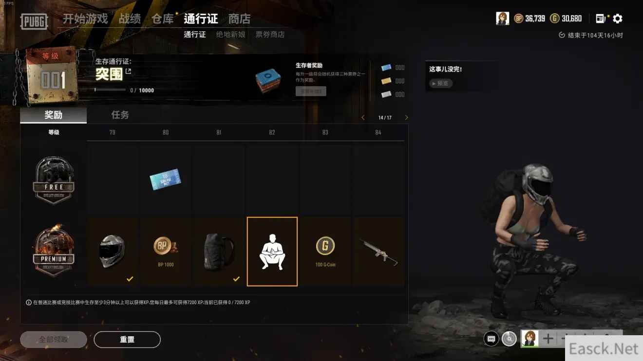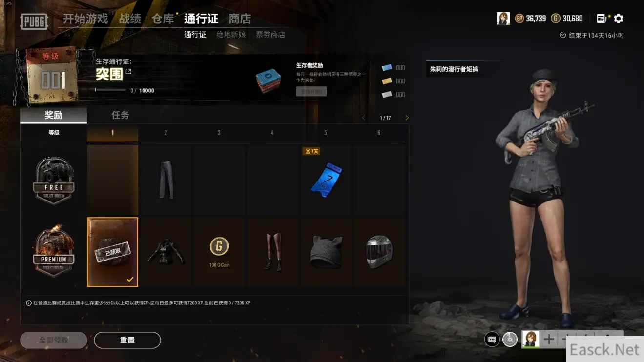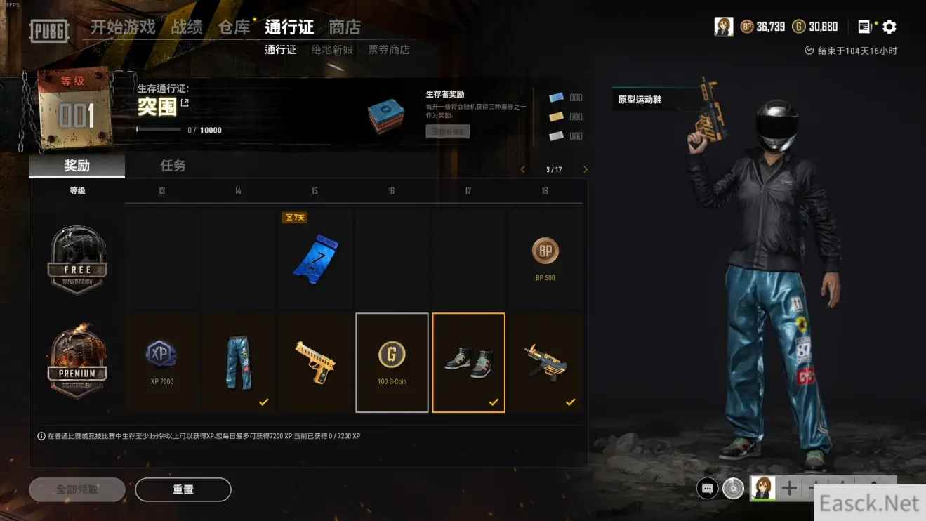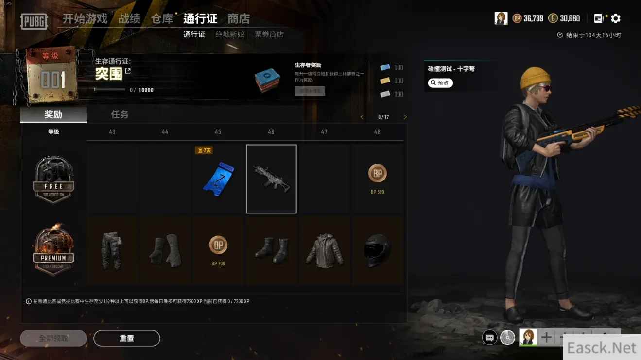 43-48级 上:单预设栏使用券(7天),魔幻六边形-G36C,BP 500 下:邓肯的潜行者长裤,邓肯的潜行者护手绷带,BP 700,邓肯的潜行者短靴,邓肯的潜行者夹克,邓肯的潜行者头盔-头盔(1级)