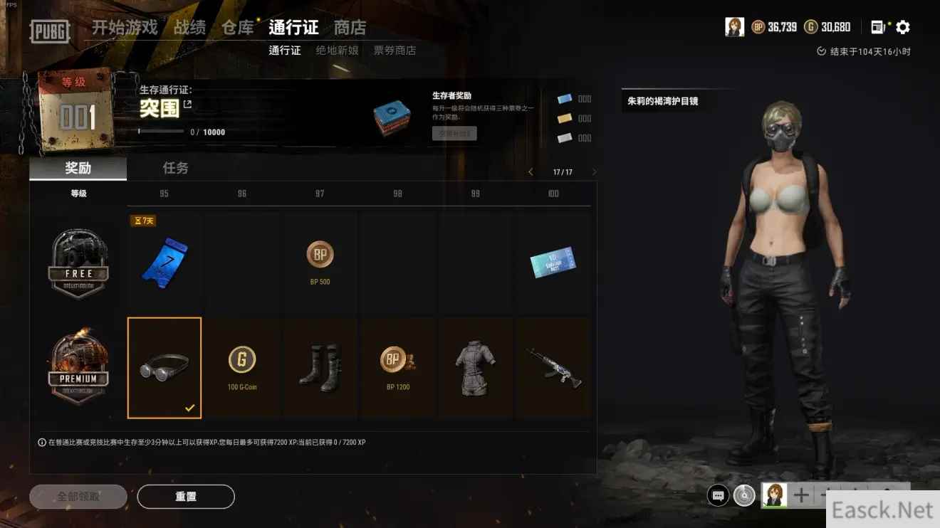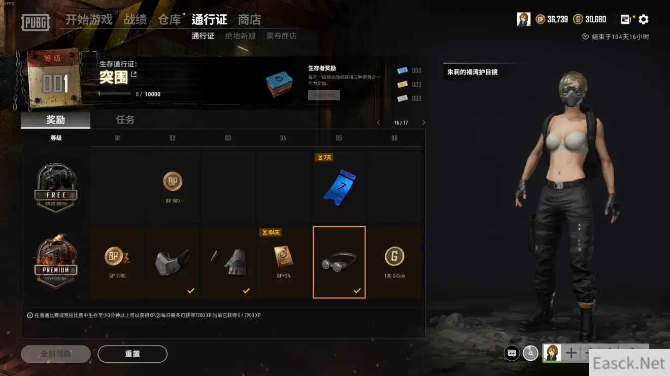 91-96级 上: BP 500,单预设栏使用券(7天) 下: BP 1000,朱莉的褐湾面罩,朱莉的褐湾手套,BP+2%,朱莉的褐湾护目镜,10OG-Coin
