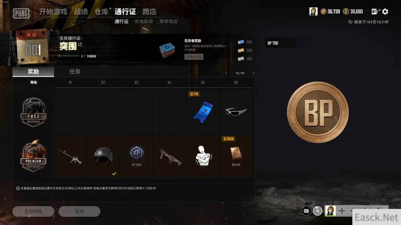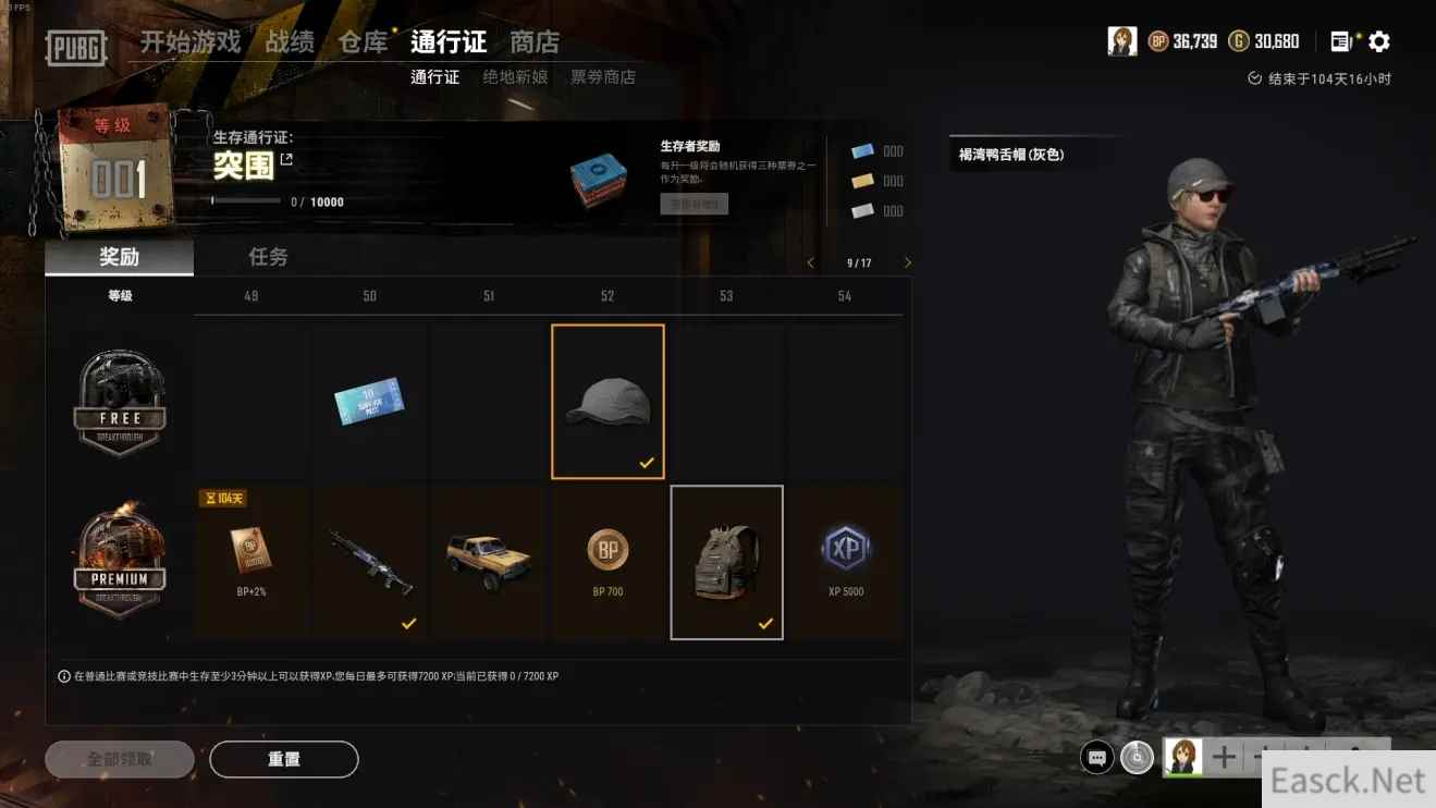 49-54级 上:蓝色票券,褐湾鸭舌帽(灰色) 下:BP+2%,午餐肉-MK14,“碰撞测试”皮卡车,BP 700,游侠帆布背包(2级),XP5000