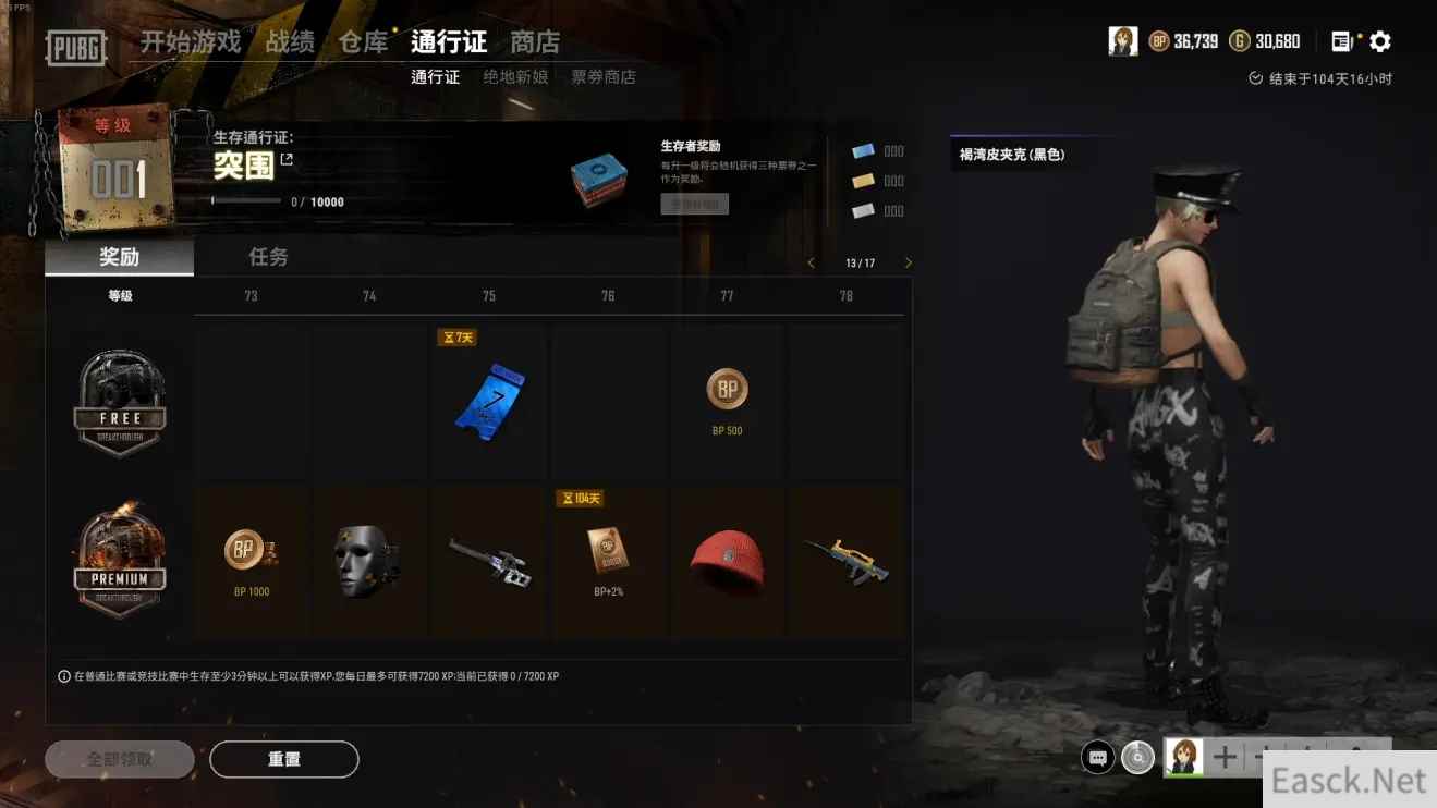 19-24级 上:蓝色票券,100G-Coin,正装长裤(棕色) 下:BP+2%,报童帽(黑色),低帮运动鞋(黑色),BP 500,飞行员的皮夹克(黑色),XP 5000
