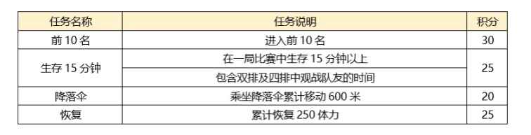也是一样分为四个任务, 进入前十(活动30积分) 生存时长满15分钟(活动25积分) 累计降落伞降落距离600米(获得20积分) 累计恢复健康值250点(获得25积分) 一天的总和也是100积分 活动奖励介绍: