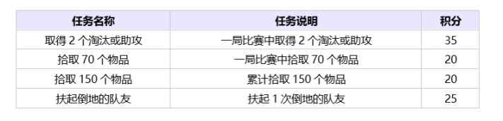 分为四个任务如下, 一局比赛中获得两个击杀或者助攻(获得35积分) 一局比赛中捡取70个物品(获得20积分) 累计捡取150个物品(获得50积分) 救起倒地队友一次(获得25积分) 一天最多获得100积分 奖励兑换介绍: