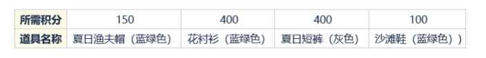花衬衫-400积分 夏日短裤-400积分 夏日渔夫帽-150积分 沙滩鞋-100积分 总和1050积分,一天100积分每天拉满需要11天的时间,小伙伴们赶紧去肝任务吧! 奖励图片预览▼