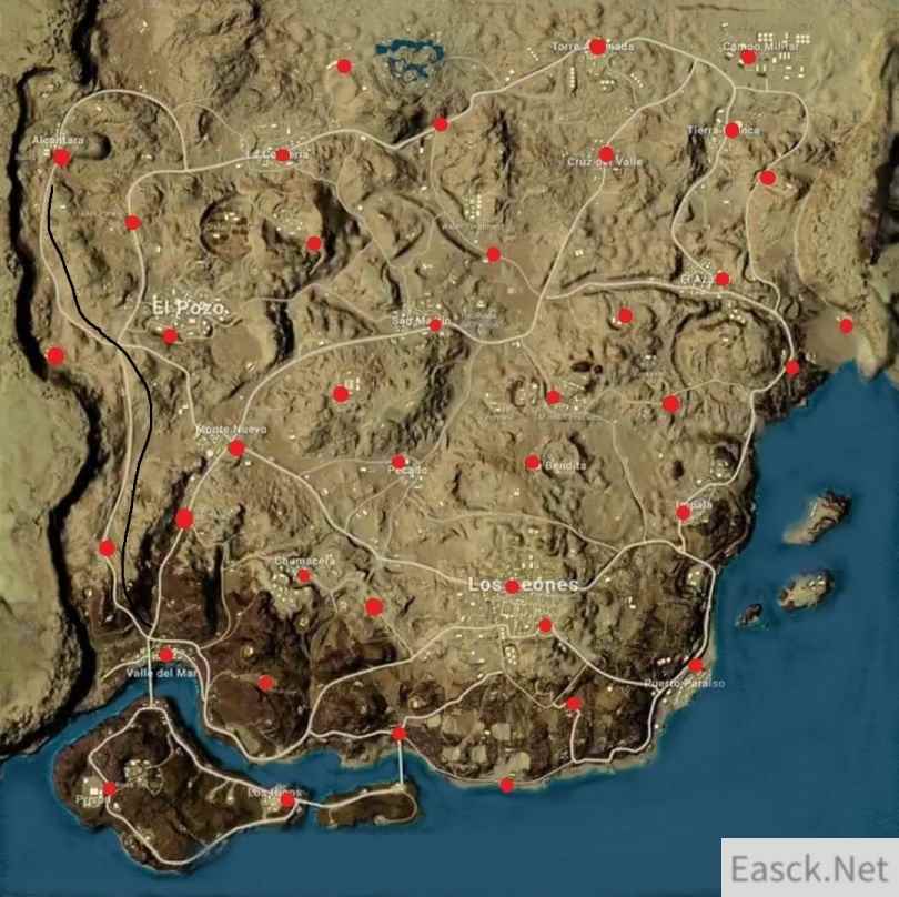 首先第一个任务就是渣男了,疯狂打胎,这个任务其实算是非常简单的了,推荐单排米拉玛地图,下图是米拉玛地图的一些刷车点,做这个任务最好的地方就是画黑线的那一条,刷车点密集,并且一条大直路,找个也去随便搜把枪,就可以沿着这条路一口气打掉12个轮胎。