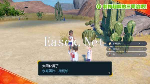 然后给另外一个小哥看蛋黄酱,会给我们水煮蛋片和橄榄油、醋。 来来回回兑换太麻烦了,直接把周围能挑战的成员都打败,获得材料,然后就互相交换就是了。
