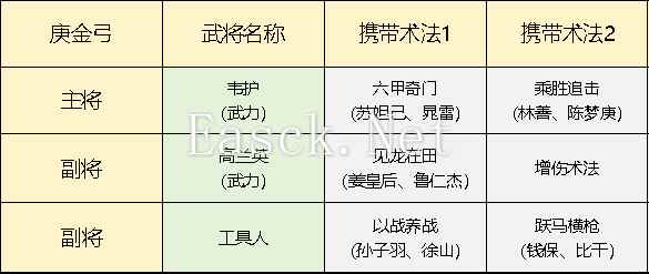 庚金弓体系 核心在与提供庚金层数,让韦护的自带术法消耗庚金层数,造成高额伤害 队伍的战斗模组是武力和追击战法 弓兵在后方,不承伤害,不考虑防御,只带一个吸血战法,全力输出 队伍搭配思路就是:高兰英叠加庚金层数,韦护打爆发庚金的伤害,剩下的一个作为工具人,可以选择增伤的辅助武将,也可以选择叠加庚金的武将。