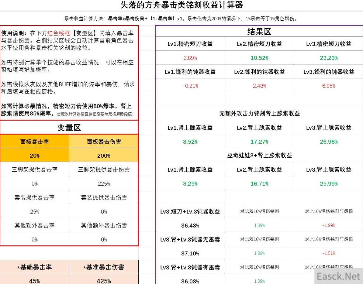 命运方舟暴击类铭刻收益怎么样,很多小伙伴们都不知道暴击类铭刻收益怎么样,接下来就带着小伙伴们一起来看看命运方舟暴击类铭刻收益计算器。 命运方舟暴击类铭刻收益计算器计算逻辑非常简单,暴击率为R,暴击伤害为D。正常暴击增伤期望值就是R*D+(1-R)*1 功能也不是特别完善,因为本身就是简单的excel公式,所以暴击率超过100%溢出的情况肯定不能准确工作了。 解决方案就是精密短刀必暴环境请保证左下角爆率是80%,肾上腺素用85%,锋利的钝器则是100%。不过这种情况下右下角三个组合计算就失灵了。我自己新做了一版发现必暴的研究只有钝器有意义,没有必爆的还带肾上腺素或者短刀的吧,所以无所谓了。 第二个问题就是肾上腺素目前的公式没有考虑到堆叠时间的情况,比实际情况要显示得更强大,等我想出来这个优化系数应该填什么之后会再改一版。目前仅供参考。 当然如果有大神愿意直接魔改更好了,公式都在隐藏的单元格里。 需要注意的是填入的数据是不能包含铭刻数值的,也就是说如果你已经身上有3级短刀了,想验算收益,请自己减去20%的暴击率。锋利的钝器则减掉50%暴击伤害。