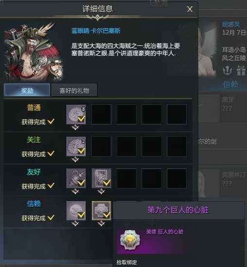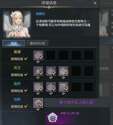 第十四个巨人的心脏 获取方式:好感度-耳语小岛-(尼娜夫)-达到信赖后获得。 玩家需要把岛上紫色任务做完。