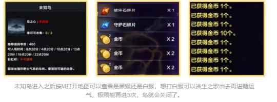 并不是每次冒险岛都会有紧闭岛,没有金币岛可以优先选择奖励海盗币的冒险岛。 限时岛屿 部分限时岛屿定点开放,可以通过左上角活动日历查看,限时岛屿奖励是可以重复参与重复获得的。比如杜基岛(打BOSS会掉落金币,一般10多金左右),未知岛(最终BOSS如果是白猴子给40金,黑猴子给20金)