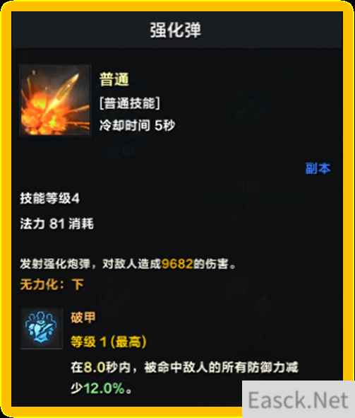 强化弹:5秒CD,8秒12%的破甲,只要不犯傻,可以保证BOSS全程的12%防御减少,非常好用 主力输出技能