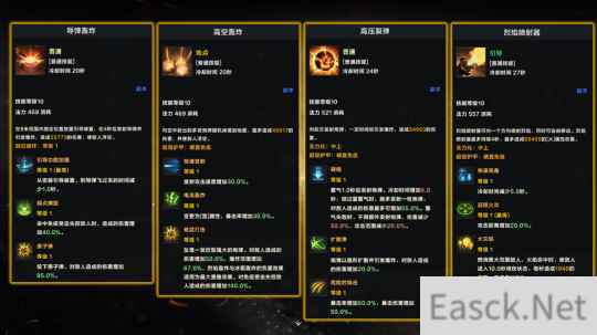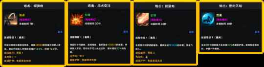 导弹轰炸,高空轰炸,枪炮常用输出技能,但也是空的概率最高的两个技能 高压裂弹,伤害平平,但好在技能天赋点好了几乎必爆 烈焰喷射器是枪炮普通技能里伤害最高的技能,前提是打满伤害, 枪炮的技能释放时都要多研究,4个主力输出技能,其中前三个都很容易空,主要是这些技能都有出伤延迟,在释放和跳伤害中间一般都有2-4秒的延迟,如果此时BOSS动了或者进了机制,那么技能也就空了,所以枪炮的玩法重点应该在如何保证技能命中率上。
