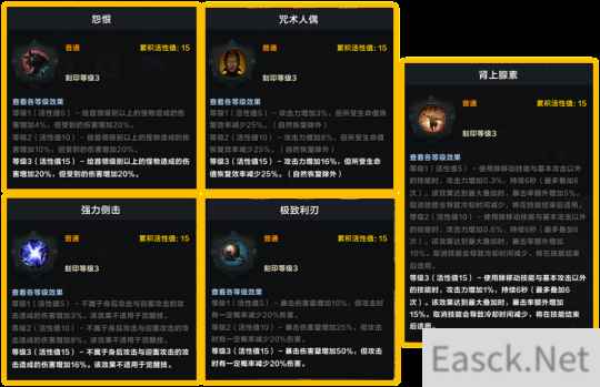 怨恨,咒术人偶,强力侧击,极致利刃,肾上腺素。这里要优先配好一个刻印(三级),再去配另一个。这样收益最大,每一个一级的蜻蜓点水配法收益极低。另外,怨恨,咒术人偶这种带负面效果的,带1级刻印还不如不带。副本里死的太快可不行。 提示:这里只是列出该职业的可选刻印,意思就是实际配置时从这里面几个里选,并不是让你全部配上 技能介绍 BUFF技能