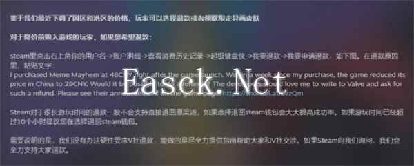 策略肉鸽放置类游戏超级键盘侠发售之后许多玩家反馈价格过高,对此官方进行了降价,许多在降价之前购买的玩家觉得比较亏,想要进行退款,下面就为大家带来超级键盘侠游戏的退款方法,有需要的玩家可以参考。 超级键盘侠游戏怎么退款 1.在steam页面点击右上角你的用户名->账户明细->查看消费历史记录->超级键盘侠->我要退款->我要申请退款,如下图。 2.在退款原因里,粘贴文字: I purchased Meme Mayhem at 48CNY right after the game launch. Within a week since my purchase, the game reduced its price in China to 29CNY. Would it be possible to do a refundd? The developers would love me to write to Valve and ask for such a refund. Please see their announcement on the game page: https://shorturl.at/6vzQm