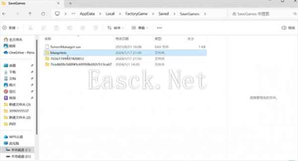 若沿上述路径查找,关闭隐藏文件夹后,若连 SaveGames 及以上层级的文件夹都没有,就比较棘手了。 建议使用搜索功能在整个电脑搜索 “blueprints” 文件夹,尽力找到文件位置。