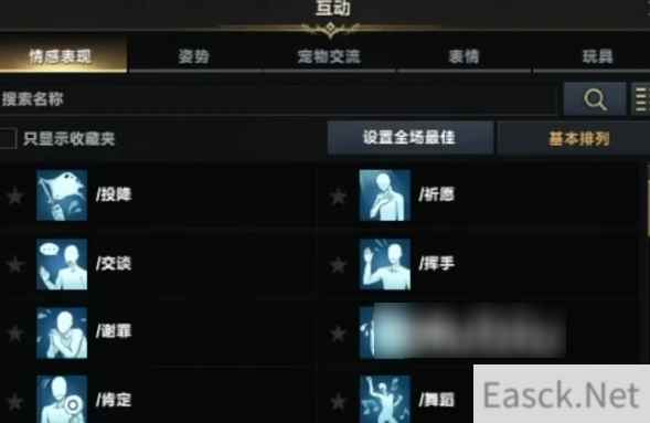 在菜单中我们可以看到分为情感表现、姿势、宠物交流、表情和玩具这几个选项。 在情感表现的排列中往下拉,拉到瘫坐这个动作,就可以看到下面正是我们所要找的敬意,而这个时候他是灰色的,这就代表尚未解锁这个表情。