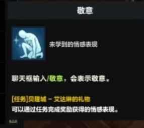 当我们将鼠标移到这个表情上面后,在右边这个表情的使用条件以及解锁方法上,可以看到需要完成贝隆城中艾达琳的礼物这个任务才可以解锁。