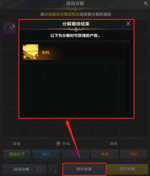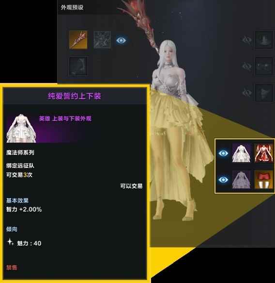 每次的外观合成消耗1个【影灵的坛子:神圣】和14个【布料】,合成后必得外观,其中结果有90%概率弹出“成功”提示,可获得紫色“英雄外观”一件;有10%概率弹出“大成功”提示可获得橙色“传说外观”一件。 合成之后的外观,也可通过交易行上架或进行购买,如果冒险家一时合不出自己心仪的外观或部位,也可以通过交易行来获取哦。 3、传说外观的属性加成、幻化、染色 每件“传说外观”将会为冒险家提供2%的基础属性加成(根据角色自身职业不同,将会提供对应的力量、智力或敏捷属性),同时会激活“幻化”栏位。 在“幻化”栏位穿戴其他外观后,此外观将显示为幻化后的外观。但幻化后的外观只会影响显示效果,其属性加成效果与倾向点数不会叠加。 摩可可举例:当一名角色穿戴传说外观(基础属性加成2%)并激活幻化栏位穿戴另一套时装外观(基础属性加成1%)时,外观对角色基础属性加成为二者中的最高值,即2%。