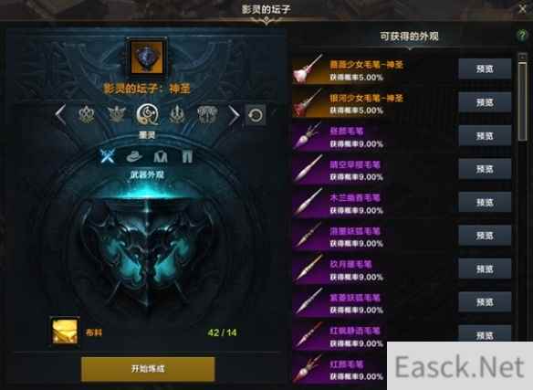 2、使用【影灵的坛子:神圣】合成外观 冒险家获得【影灵的坛子:神圣】和【布料】后,打开背包右键点击坛子即可使用,在点击坛子后会弹出【影灵的坛子】界面,点击职业图标和部位来选择想要合成的外观部位(默认选项为当前登录的角色的职业与武器外观)。 冒险家可以点击最右侧的【预览】来进行“试穿”。选择完毕后点击【开始炼成】消耗【布料】,将随机合成所选职业、部位的一件时装外观!