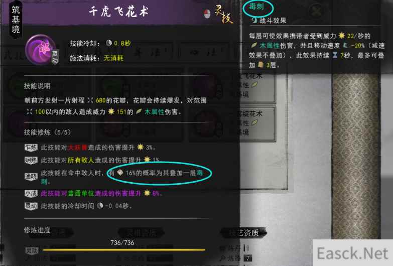 《鬼谷八荒》中木灵根玩家最好用的神通就是溟空毒龙花,这个神通想要触发需要配合能够给敌人上毒BUFF的武技或者绝技,推荐千虎飞花术,每毒死一个敌人就会增加一层毒蚀,有了四层毒蚀就能使用神通了,更多如下。