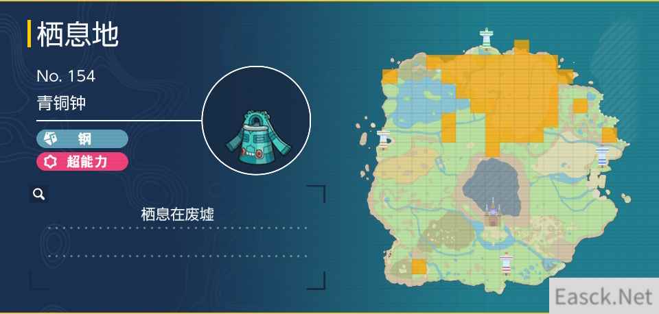 宝可梦朱紫青铜钟在哪里抓青铜钟是钢和超能力属性的宝可梦,想要抓青铜钟可以去地图北部霜抹山的废墟附近,大部分都在霜抹山,具体分布区域如下图。