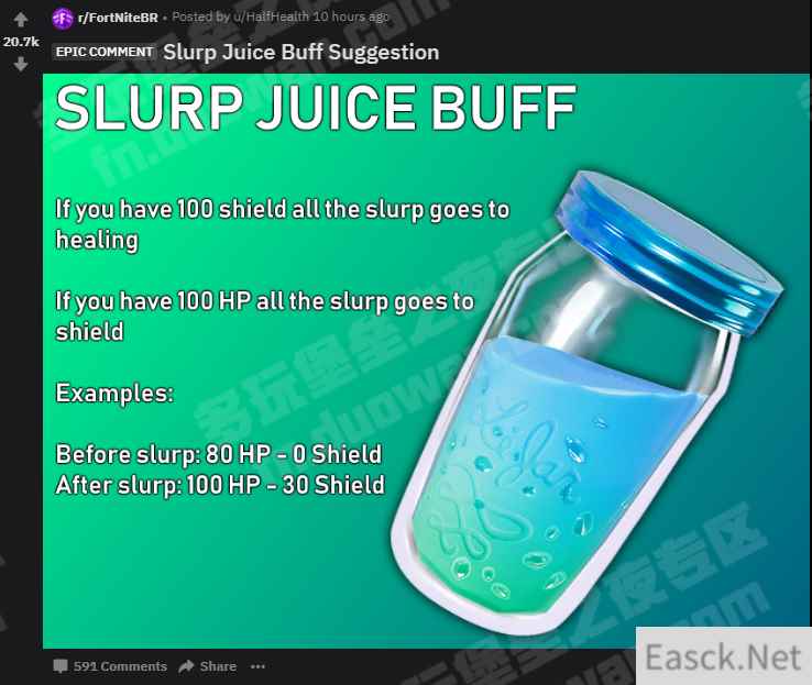 堡垒之夜在即将到来的V5.10版本中,果汁将会大幅度加强,而加强的原因是因为有玩家在Reddit论坛发表了一篇建议加强果汁的帖子说起。那么新果汁会给玩家带来什么样的体验呢?一起期待吧。 Reddit帖子