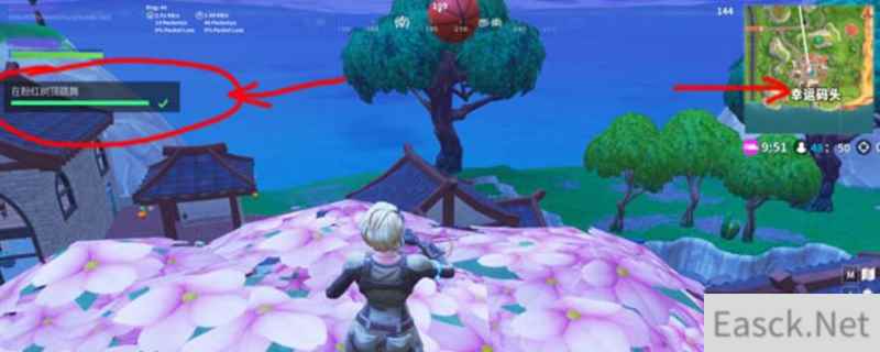 堡垒之夜只有一棵粉红色的树,位置在幸运码头四个房子的中间,在这里跳舞的话很容易被群攻,想要做这个任务建议50V50或者圈距离很远的时候再做。还有要注意的是这棵树是可以被锄掉或者打掉的,想要做的玩家最好一开始就落在上面。