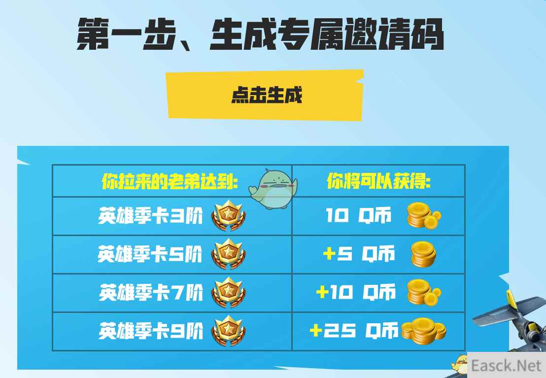 活动地址:点击跳转 首先,登录活动网站,生成专属邀请码拉老弟,只要英雄季卡达到3、5、7、9,你就能对应领取10、5、10、25QB,也就是说一个老弟最多能给你带来50QB!