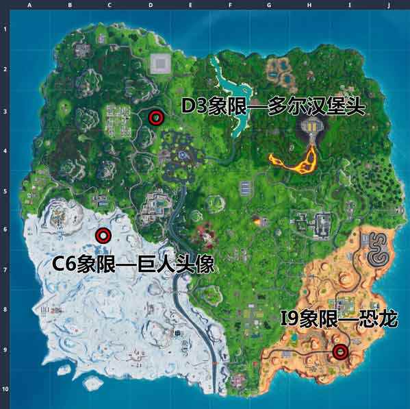 堡垒之夜是目前全球火爆的一款射击游戏,游戏当中拥有PVP,PVE两个主力玩法,且都非常受到欢迎,游戏的更新也非常频繁,很多玩家都想知道堡垒之夜天狐涂装的多尔汉堡头恐龙以及巨人头像在哪?下面我就给大家详细介绍一下。 挑战1:探访天狐涂装的多尔汉堡头、恐龙以及巨人头像 全地图: