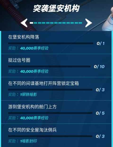 1.在堡安机构降落(0/1)奖励40000点赛季经验 降落任务,比较简单,直接降落即可,但是别忘了和之后的几个任务一起做。 2.挺过信号圈(0/10)奖励40000点赛季经验 每存活一个圈即可完成一点进度,1-3把就可以完成。 3.在不同的间谍基地打开阵营锁定宝箱(0/3)奖励钢铁暗影