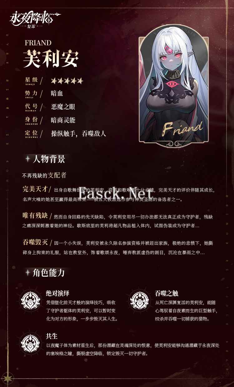 《永夜降临:复苏》是一款西方幻想题材的放置卡牌RPG手游。玩家作为「逐光」组织的「驱夜者」,穿行于错综复杂的教派阵营中,探寻名为「永夜」的真相。而隐藏在虚无之中的双眼,正默默地注视着一切…… 芙利安 “逐光的驱夜者,如此令人嫉妒的才华和名号,越看...就越想把你们那张虚伪的面具吞掉。"