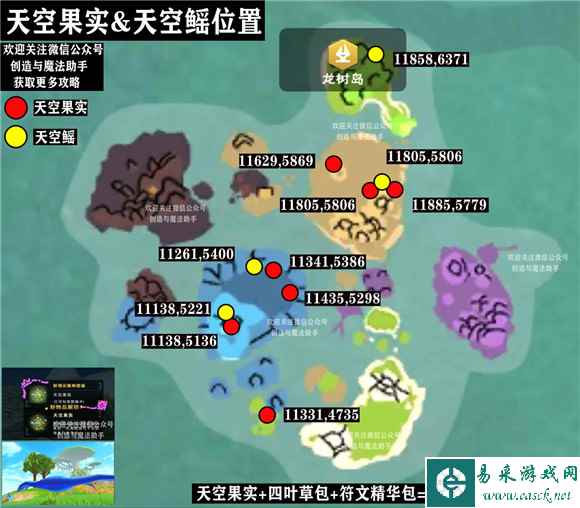 《创造与魔法》天空鳐饲料配方天空瑶饲料=符文包+天空果实+四叶草包 天空鳐最高属性 陆行7600+ 负重38 飞行8100+ 天空鳐位置 1、以下就是天空鳐的位置图标,黄颜色是天空鳐。 2、图中红色的标志就是天空果实的位置。