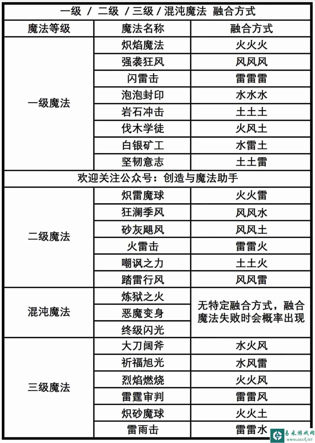 《创造与魔法》三级符文魔法配方雷雨击 合成方式:雷+雷+水 对前方最多两个目标释放符文闪电造成伤害 大刀阔斧 合成方式:水+火+风 使用魔法后常规攻击距离提升2米,持续10秒 祈福旭光 合成方式:水+风+雷 此可以自己使用,也可以给好友加血 跟法杖的治疗效果类似 但没有法杖加血快 持续加血效果 烈焰燃烧 合成方式:火+火+风 释放后产生一个火圈 对周围最多10个目标造成燃烧伤害 雷霆审判 合成方式:雷+雷+风 雷击群体攻击,对周围最多7个目标造成伤害