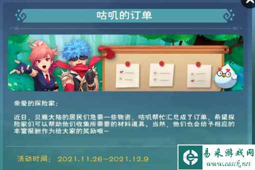 《创造与魔法》2021感恩节活动介绍活动时间: 11月26日-12月9日 活动内容: 参与咕叽的订单活动,需要探险家达到20级,在活动界面就可以看到啦,咕叽需要探险家们找到一些物品,在活动内进行提交 界面左侧就是咕叽需要物品的列表,收集物品上交就可获得相应的积分和道具奖励,点击物品可以查看物品的详情哟,不满意的订单可以进行刷新 要注意,刷新是有上限次数哒,活动期间的每日0点左右,咕叽会过来给大家上架新的订单,左下角就是订单刷新的倒计时啦,想要获得最终奖励,只需要提交任务获得积分