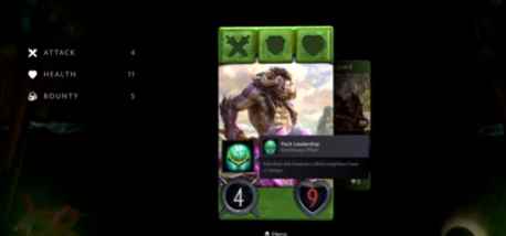 生物卡不一定都有阵营,生物卡都拥有自己的特殊能力。有的类似于英雄的技能,也有类似于炉石中拥有战吼效果的生物,还有一些生物的能力是在攻击后产生效果。生物卡被消灭后的赏金数目前不太确定(视频中没有展示出来)。 6、装备卡