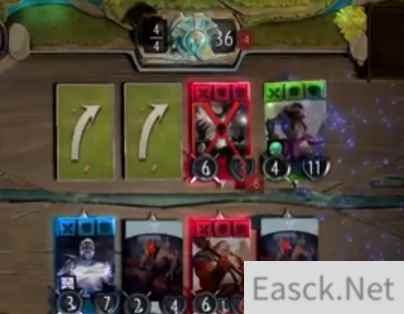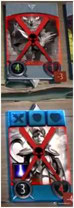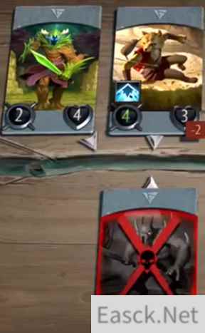 护甲值存在负数的情况,当护甲为负数时,该单位受到的伤害增加。下图中,狼人的护甲为-2,当他和3点攻击力的宙斯战斗时,受到的伤害变为了5点。 ②战斗目标 Artifact的战斗目标选择和最老版的游戏王相近,是对位战斗的模式。棋盘上的卡牌会优先和正对着的单位进行战斗。如果正对的位置是空着的,则会由系统随机抽取一张方向牌来指定攻击目标。当方向牌指向的位置为空时,该生物将在战斗阶段直接对对方的塔造成伤害。
