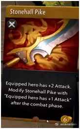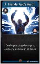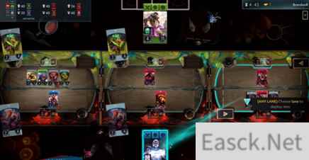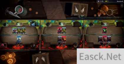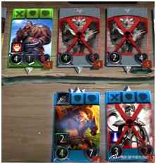 装备卡是只能在购物阶段获取的卡牌。卡背颜色为金黄色,通常会有BUFF英雄能力的效果。特定装备还会为英雄增加特殊效果。 佩戴使英雄攻击力增加2点,同时令佩戴英雄在每次攻击后增加1点攻击力。 五.游戏流程 1、部署阶段 ①第一回合 游戏第一回合开始前,系统将会从你的5张英雄卡中抽选3张,随机均分在3条路上。同时还会刷新3只小兵,随机部署在你的三条路上。