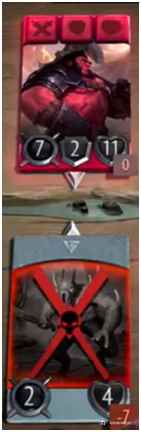 一张英雄卡有以下要素: ①身材 高于一般生物的攻击力以及血量,某些特定英雄还自带护甲值,比如斧王。