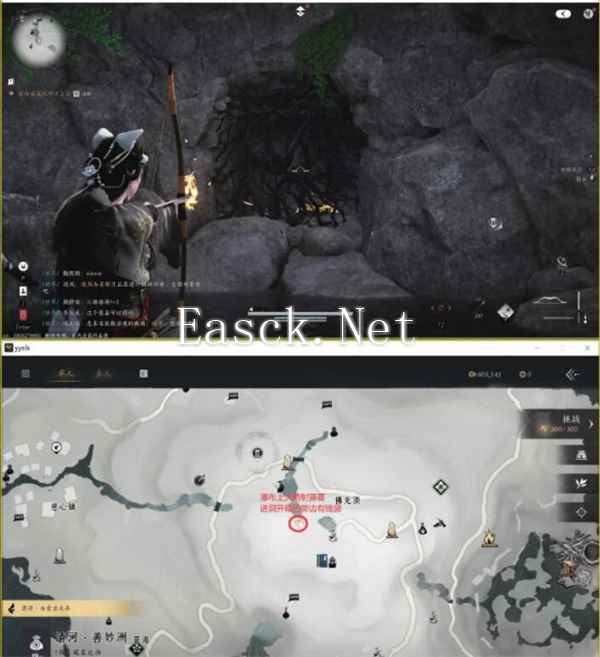 4、再前往下图位置,使用火箭射藤蔓,进入洞中在箱的旁边捡起绣着邪字的奇怪钱袋;