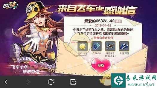 来自飞车的感谢信领取地址分享 活动入口: 游戏内--活动中领取 来自飞车的感谢信奖励: 金币、点券、永久端游纪念胎印、7天卓越 来自飞车的感谢信中奖励的金币和点券数量,根据玩家端游游戏时间,有些不同。 |