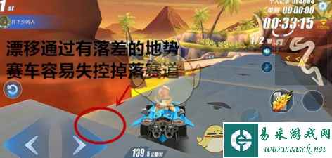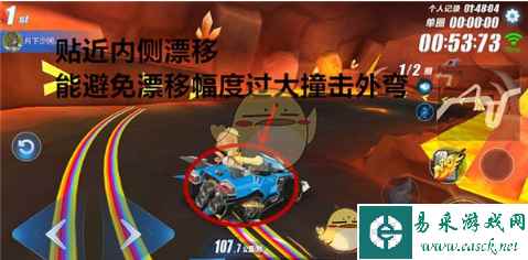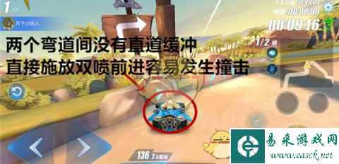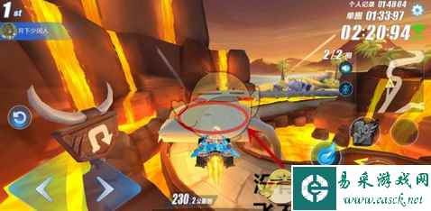 这个难点形成的根本原因在于赛道狭窄,而赛车漂移摆动的幅度很大。那么要解决二者之间的矛盾有两种办法,第一种,过弯时踩刹车或者不施放小喷降低车速;第二种,贴近内侧弯道漂移,同时死死稳住赛车行驶方向,让漂移轨迹呈缓和的曲线。这两种方法都可以遏制漂移时赛车的摆动幅度,不过相对而言第二种方法更加难以掌握,需要不断地从失误中总结经验才能习得。 【难点3.空中赛道】