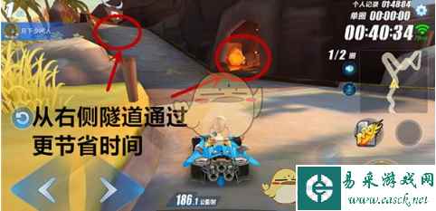 与连环弯道紧连着的是两条岔道,一条是宽阔的大道,一条是狭窄的隧道。从大道行驶需要通过一个U型弯道与L型弯道,而从狭窄隧道通过只需要经过两个L型弯道即可,并且还能比大道多踩上一个加速带。所以车手们在行驶过程中都会一个劲地往隧道里钻,可是隧道狭窄而两个L型弯道又紧邻,所以对漂移角度掌控不完美的车手百分百会发生碰撞。