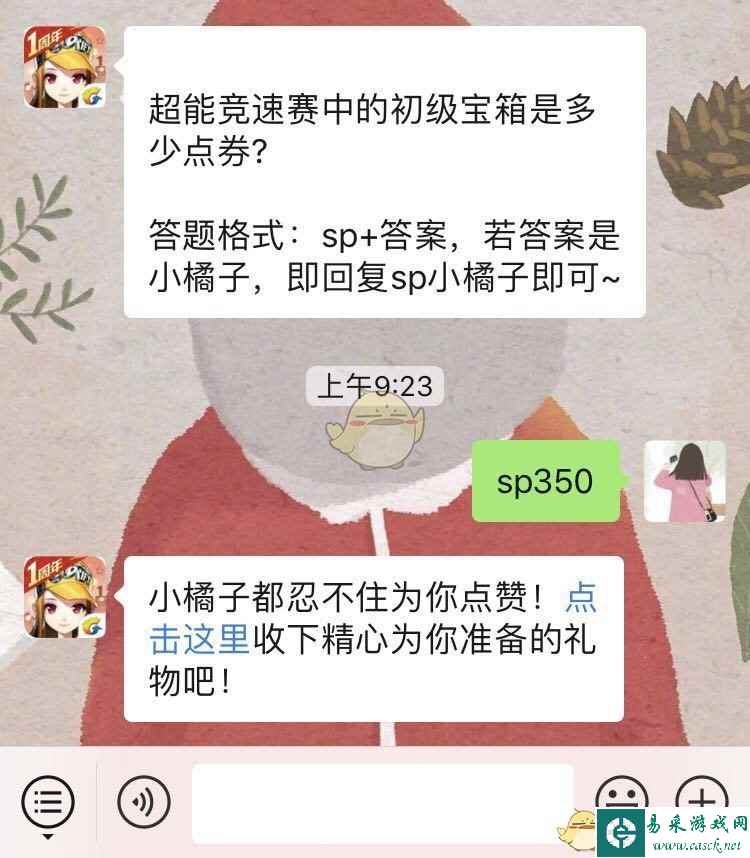 问题:超能竞速赛中的初级宝箱是多少点券? 正确答案:sp350 (答题格式:SP+答案,若答案是小橘子,即回复SP+小橘子即可) 以上就是小编带来的关于QQ飞车中超能竞速赛中的初级宝箱是多少点券?的全部内容啦,小伙伴们赶紧去答题领取奖励吧,更多精彩攻略欢迎关注手游网。 |