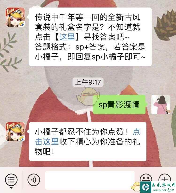 问题:传说中千年等一回的全新古风套装的礼盒名字是? 正确答案:sp青影渡情 (答题格式:SP+答案,若答案是小橘子,即回复SP+小橘子即可) 以上就是关于QQ飞车手游传说中千年等一回的全新古风套装的礼盒名字是的全部内容啦,大家赶紧去答题领奖吧。 |