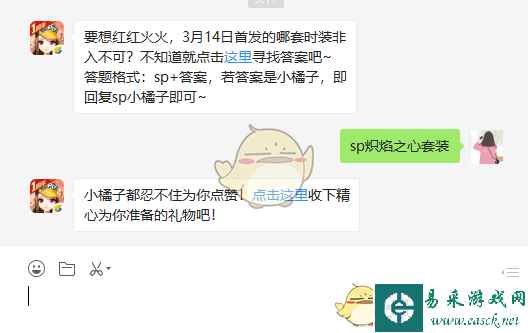 问题:要想红红火火,3月14日首发的哪套时装非入不可? 正确答案:sp炽焰之心套装 (答题格式:SP+答案,若答案是小橘子,即回复SP+小橘子即可) 以上就是关于QQ飞车手游QQ飞车手游要想红红火火,3月14日首发的哪套时装非入不可的全部内容啦,大家赶紧去答题领奖吧。更多游戏攻略欢迎关注手游网。 |