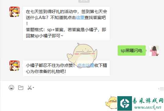 问题:在七天签到得好礼的活动中,签到第七天会送什么A车? 正确答案:sp黑曜闪电 (答题格式:SP+答案,若答案是小橘子,即回复SP+小橘子即可) 以上就是关于QQ飞车手游在七天签到得好礼的活动中,签到第七天会送什么A车?的全部内容啦,大家赶紧去答题领奖吧。更多游戏攻略欢迎关注手游网。 |